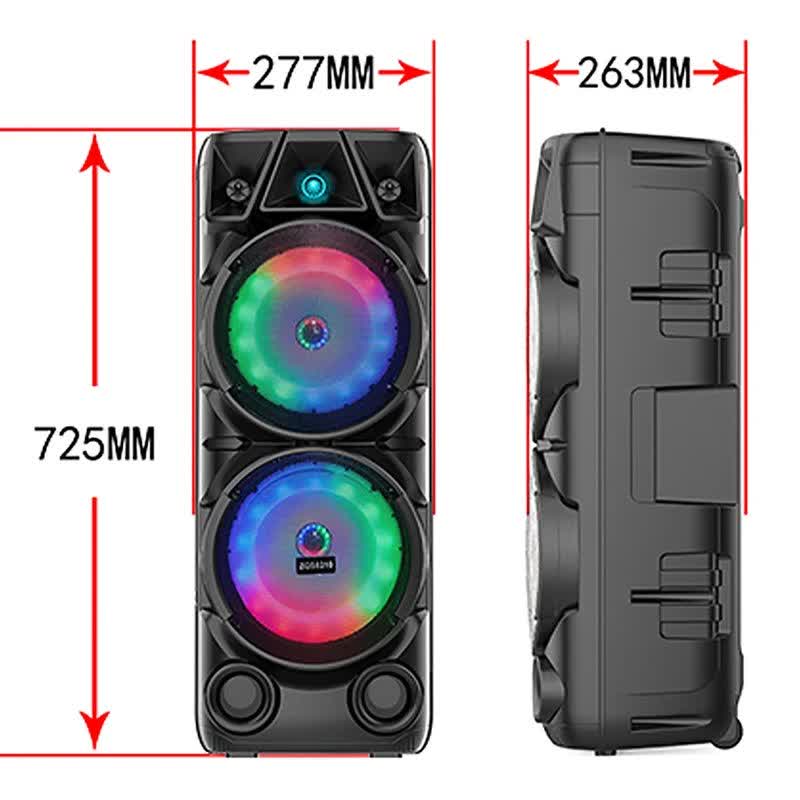 مشخصات فنی کامل توان اسمی: 80 W RMS (تا 2300 W PMPO) باتری داخلی: لیتیوم-یون 4500 mAh – تا 5 ساعت پخش مداوم در 70٪ صدا منابع تغذیه: برق شهری 220 V یا شارژ 15 V مستقیم بلوتوث 5.0 با بُرد 10 متر، پشتیبانی از TWS (جفتشدن دو اسپیکر) ورودیها: USB، Micro-SD، AUX 3.5 mm، رادیو FM، میکروفون بیسیم ابعاد بدنه: 46 × 22 × 20 cm | وزن: ≈ 3 kg نورپردازی RGB چندحالته با کلید خاموش/روشن جداگانه نمایشگر LED میزان ولوم، وضعیت مود و شارژ باتری ---