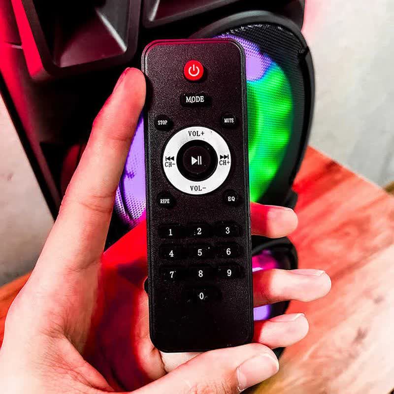عملکرد و ویژگیها 1. صدای ۳۶۰° پرتابی – سابووفر قدرتمند + توییترهای کریستالی برای بیس عمیق و تریبل شفاف. 2. کارائوکه فوری – میکروفون وایرلس و افکت اِکو، ستارهی آوازخوانی شو! 3. Party Light RGB – رقص نور هماهنگ با ضرب آهنگ، خاموششدنی برای محیط ساکت. 4. پخش همهجوره – بلوتوث، فلش، کارت حافظه، AUX یا رادیو FM. 5. حالت پاوربانک – درگاه USB میتواند گوشیات را شارژ کند.