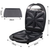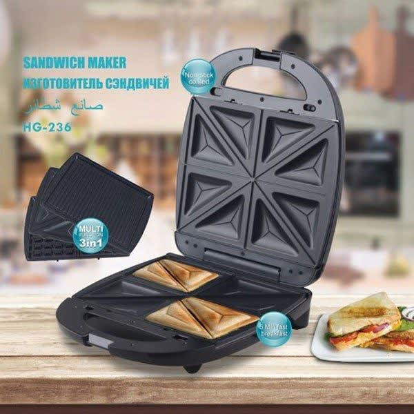 اقلام داخل جعبه و جنس قطعات بر اساس اطلاعات ترب، دیجیکالا و باسلام: دستگاه اصلی با بدنهای از استیل ضدزنگ و پلاستیک مقاوم سه صفحه جداشونده (اسنکزن، وافلزن و گریل) با روکش نچسب چدنی برای پخت آسان بدون چسبیدن غذا چراغ نشانگر جهت نمایش وضعیت آمادهبهکار و عملکرد دستگاه دفترچه راهنما و کارت گارانتی معتبر همراه بستهبندی استاندارد رنگبندی: عمدتاً رنگ مشکی براق که جلوهای شیک و مدرن دارد