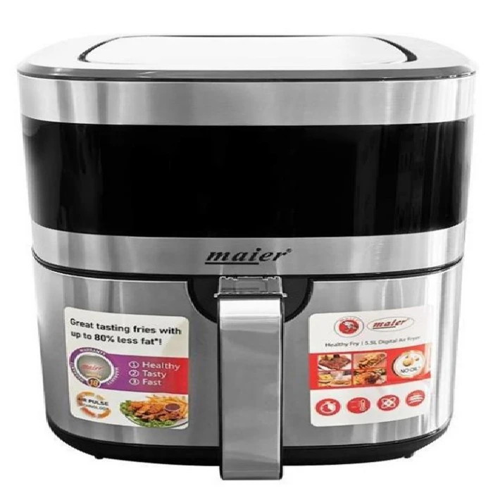 اقلام داخل جعبه و ویژگیهای ظاهری: دستگاه سرخکن مایر MR-975 با بدنه ترکیبی از پلاستیک مقاوم و استیل ضدزنگ — در رنگهای مشکی و نقرهای کلاسیک سبد تفکیکپذیر نچسب با پوشش استیل — بسیار مقاوم و قابل شستوشو صفحه نمایش لمسی دیجیتال — با قابلیت تنظیم دما، زمان و برنامههای پخت برچسبهایی مانند «سرخ کردن بدون روغن»، «بدنه استیل»، «ظرفیت 5.5 لیتر» در جعبه وجود دارد