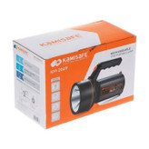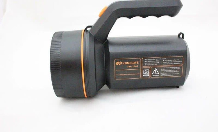 اقلام داخل بسته چراغ قوه KM-2669 با بدنهای از جنس پلاستیک ABS مقاوم و طراحی ارگونومیک با دسته نگهدارنده و بند برزنتی برای حمل آسان . دو شاخه برق برای شارژ دستگاه قابل شارژ بهوسیله برق شهری .