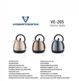 مشخصات فنی در منابع موجود اطلاعات زیر درباره VE-205 تأیید شده است: توان مصرفی: 2200 وات ظرفیت مخزن: 1.7 لیتر نوع گرمایش: المنت حرارتی جنس داخل کتری: استیل ضد زنگ قابلیتها: • سیستم قفل ایمنی • چرخش ۳۶۰ درجه • چراغ نشانگر وضعیت • کلید روشن/خاموش • سیستم قطع خودکار در هنگام جوش آمدن آب
